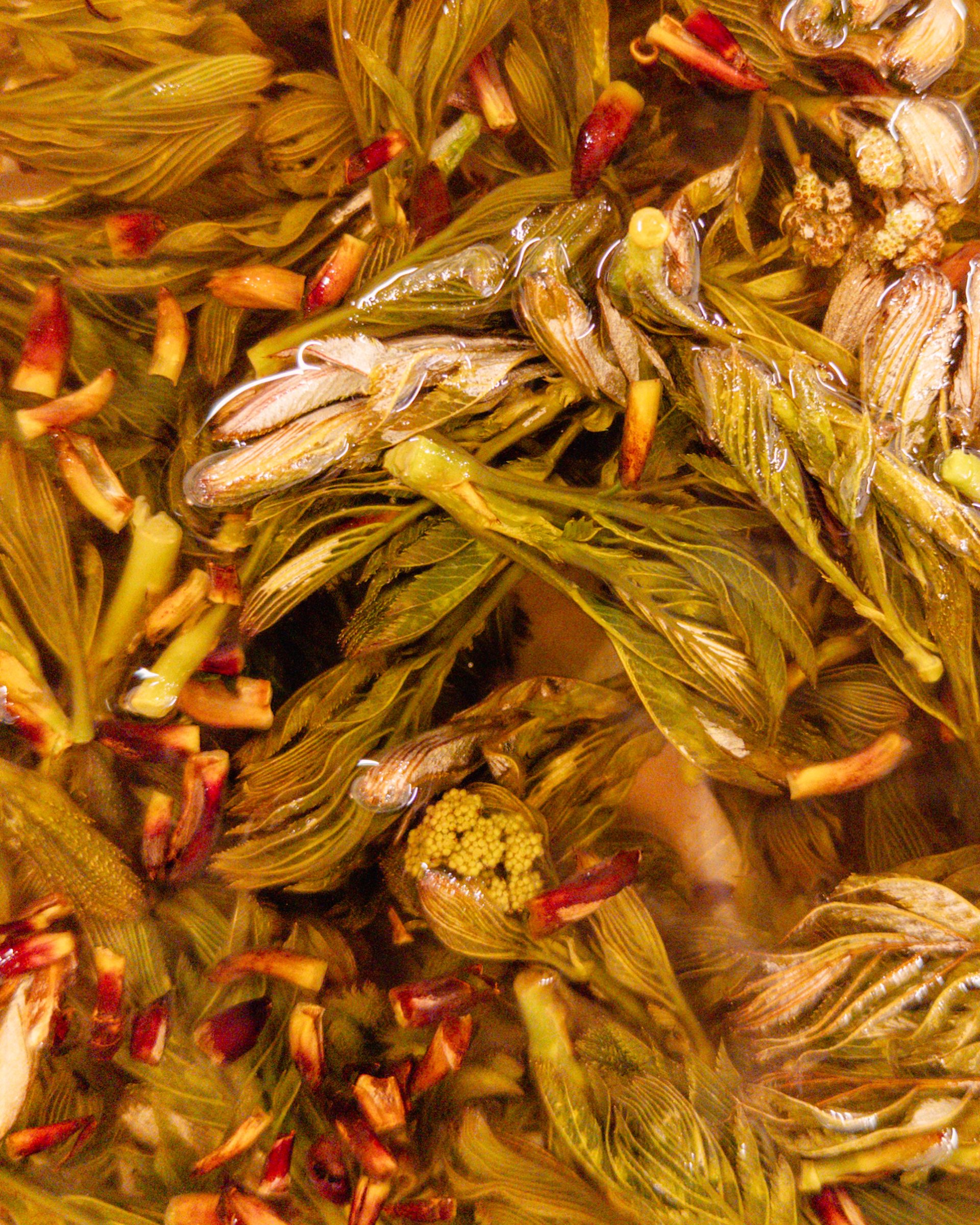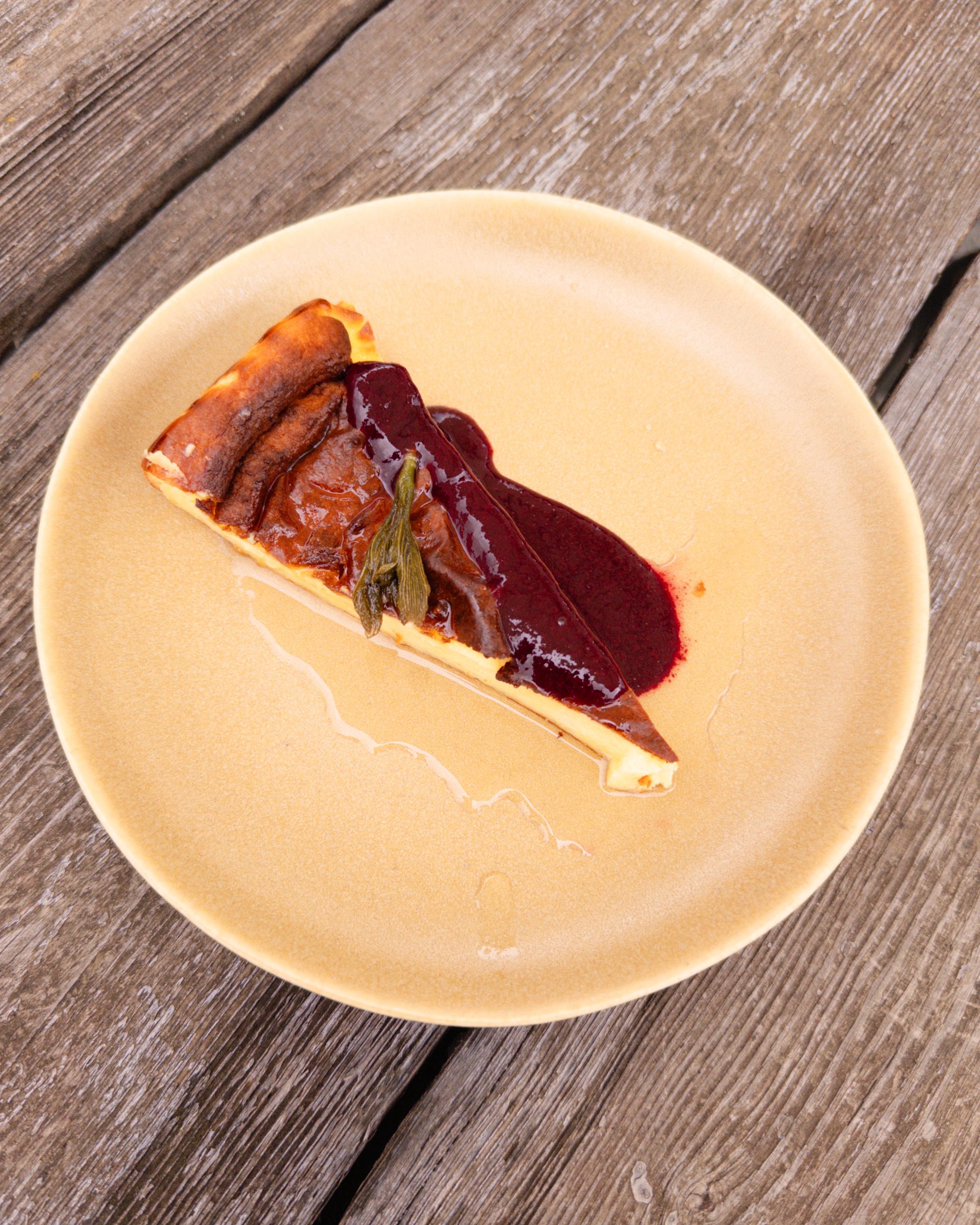 Semola-Kuchen mit einer säuerlichen Jostaabeeren-Sauce und einem blumig-süßen Sirupauszug aus der Eberesche. Die jungen Triebspitzen enthalten nämlich Blausäure und geben somit den Geschmack von Marzipan/Bittermandeln ab.