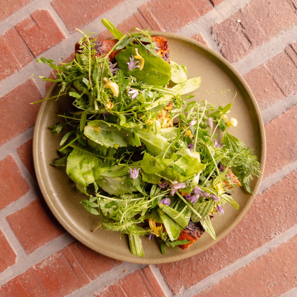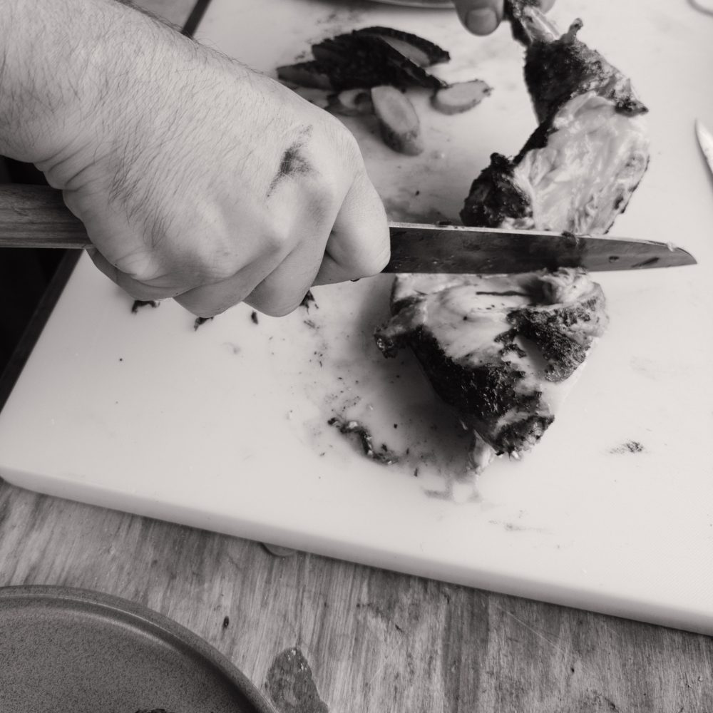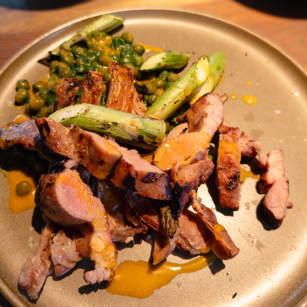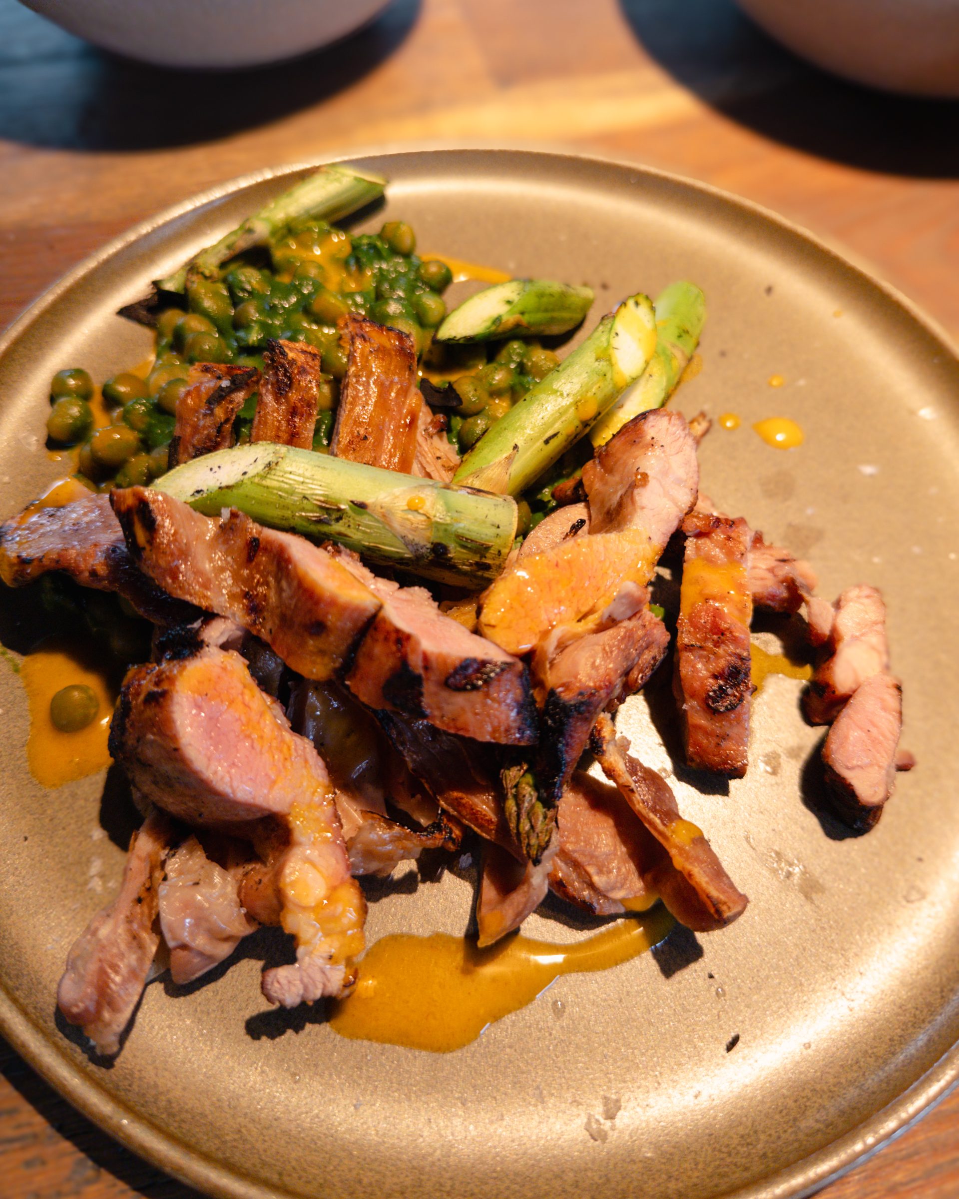 Letzten Sonntag gab es selbstgemachte Pizza mit einem Wildkräutersalat Topping, Schweinebauch mit gegrillten Frühlingszwiebeln & Weißen Bohnen, Ziege & Erbsen mit Nesseln und Sandornsauce & gegrilltem grünen Spargel und 1/2 Huhn mit gegrillten Karotten. Dazu frische Salate, Dipps und geräucherte Kartoffeln.