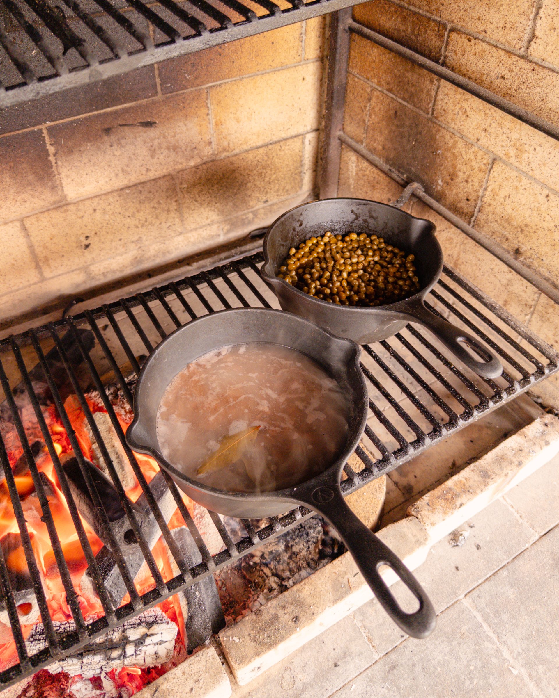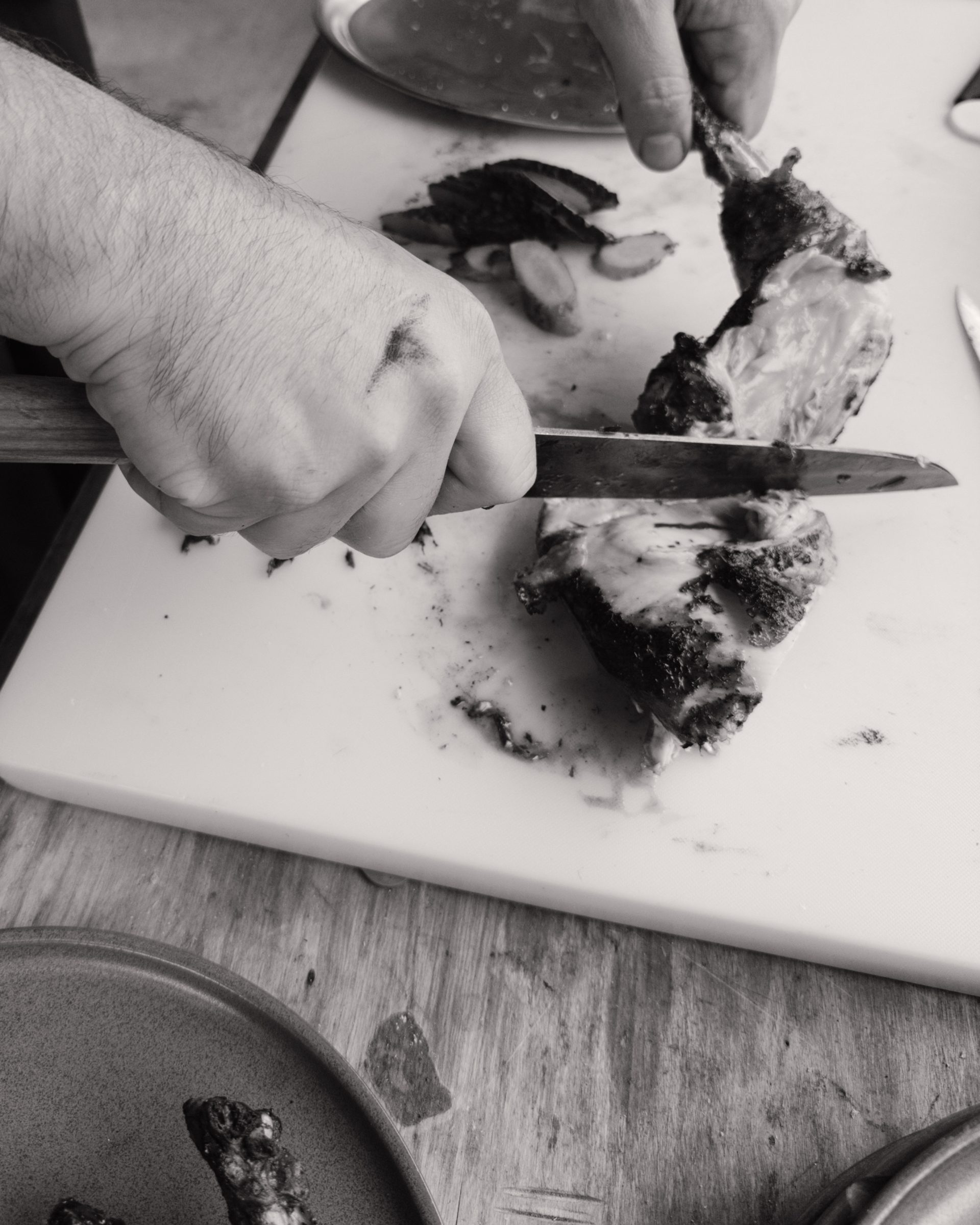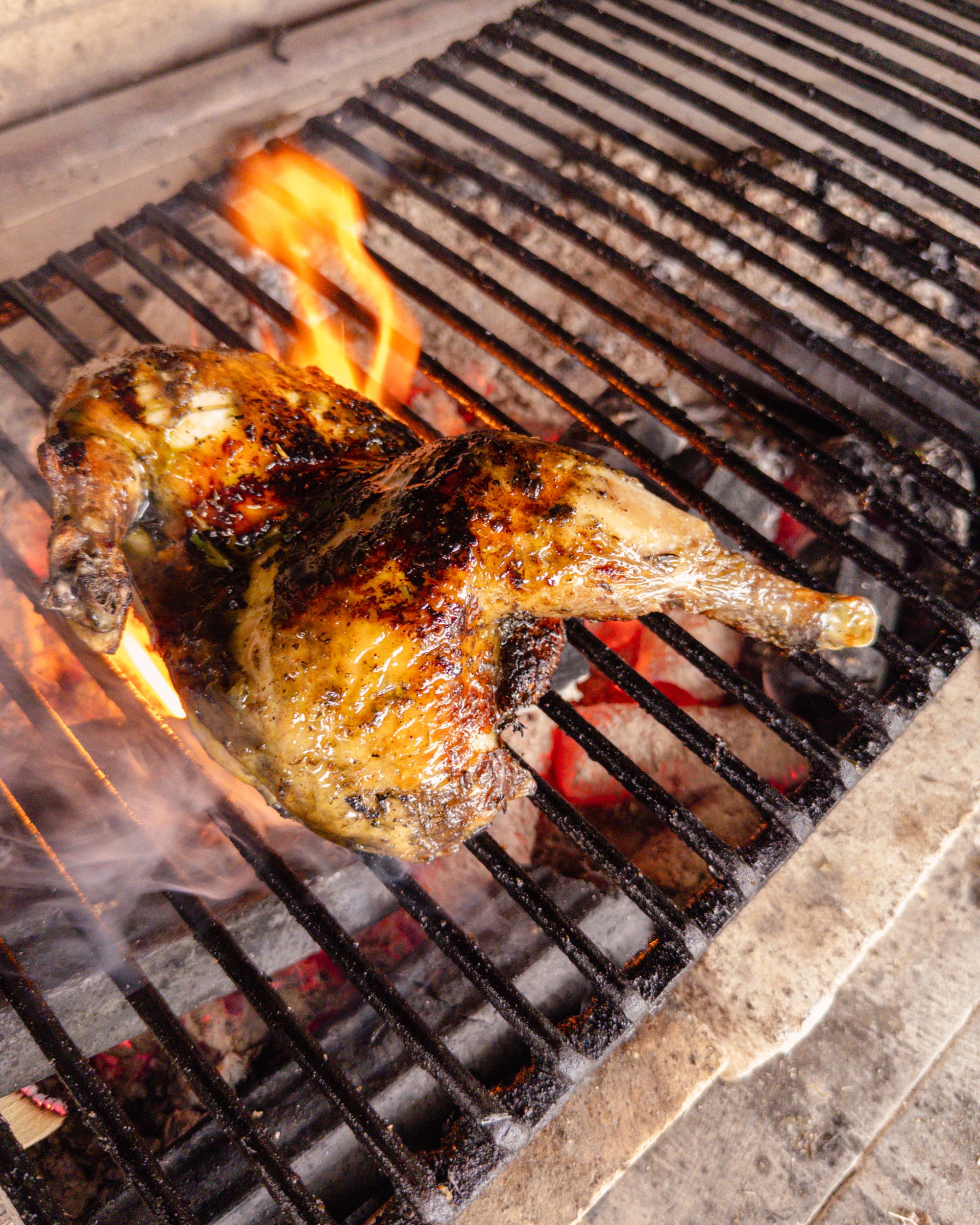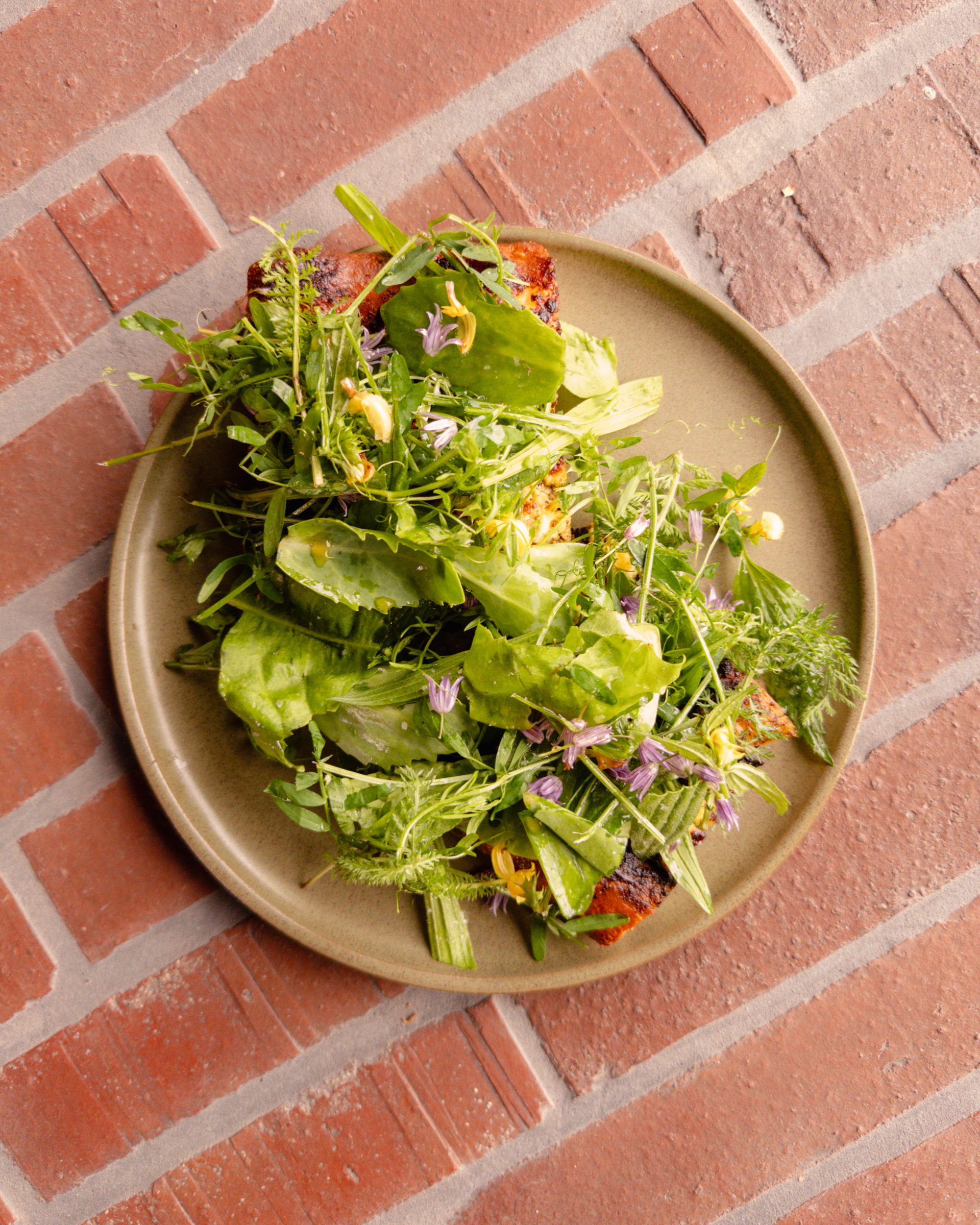 Letzten Sonntag gab es selbstgemachte Pizza mit einem Wildkräutersalat Topping, Schweinebauch mit gegrillten Frühlingszwiebeln & Weißen Bohnen, Ziege & Erbsen mit Nesseln und Sandornsauce & gegrilltem grünen Spargel und 1/2 Huhn mit gegrillten Karotten. Dazu frische Salate, Dipps und geräucherte Kartoffeln.