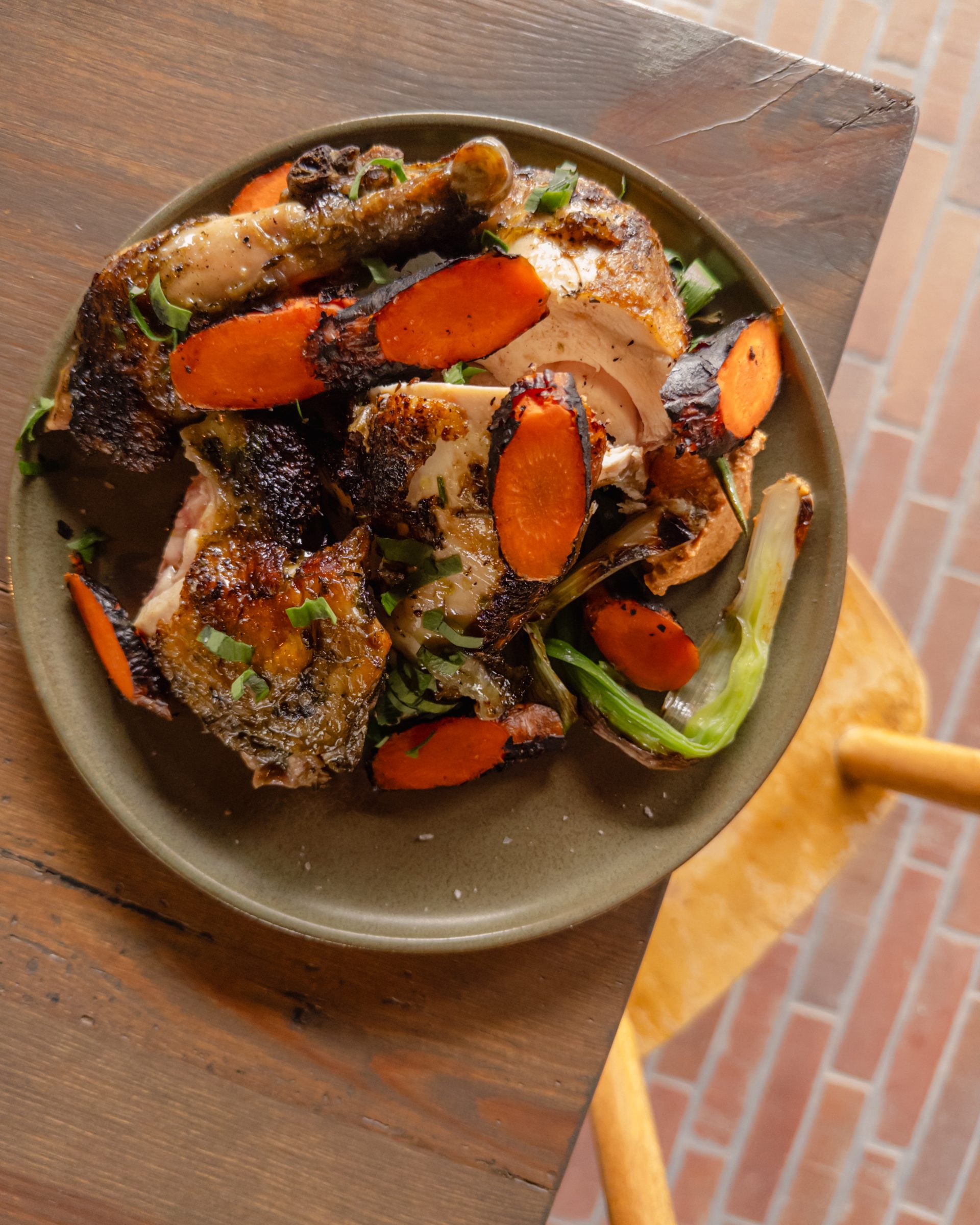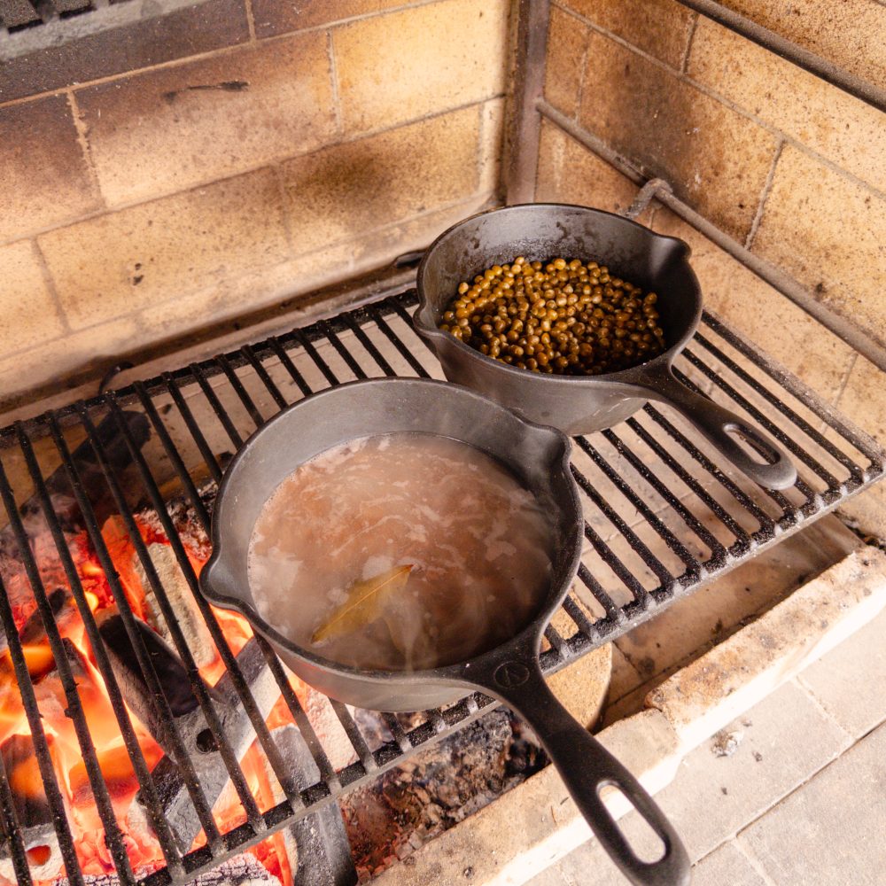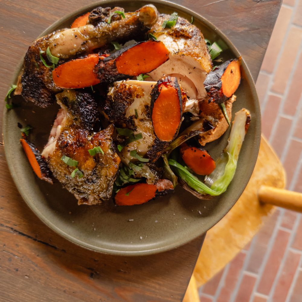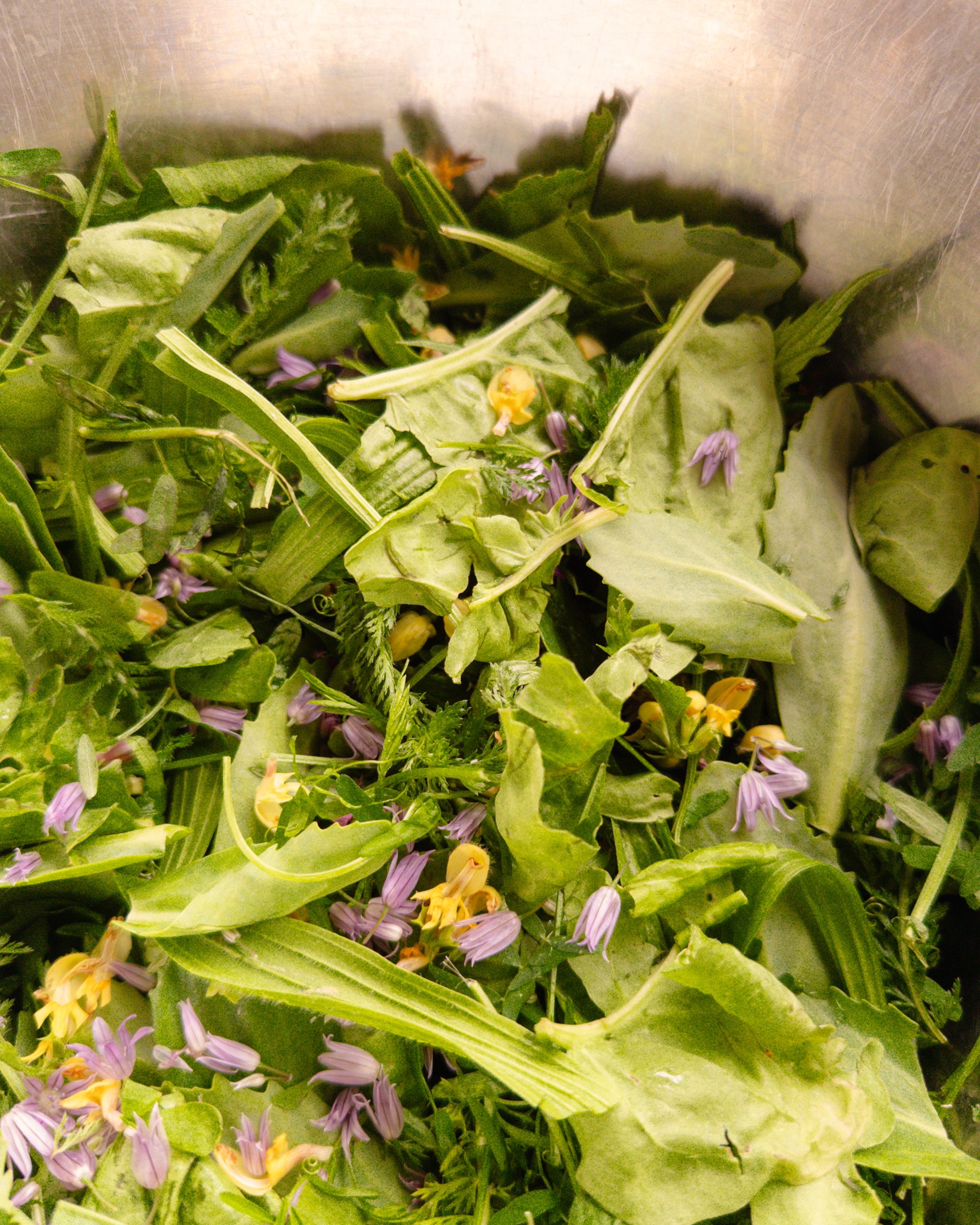 Letzten Sonntag gab es selbstgemachte Pizza mit einem Wildkräutersalat Topping, Schweinebauch mit gegrillten Frühlingszwiebeln & Weißen Bohnen, Ziege & Erbsen mit Nesseln und Sandornsauce & gegrilltem grünen Spargel und 1/2 Huhn mit gegrillten Karotten. Dazu frische Salate, Dipps und geräucherte Kartoffeln.