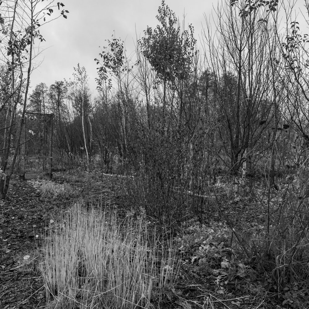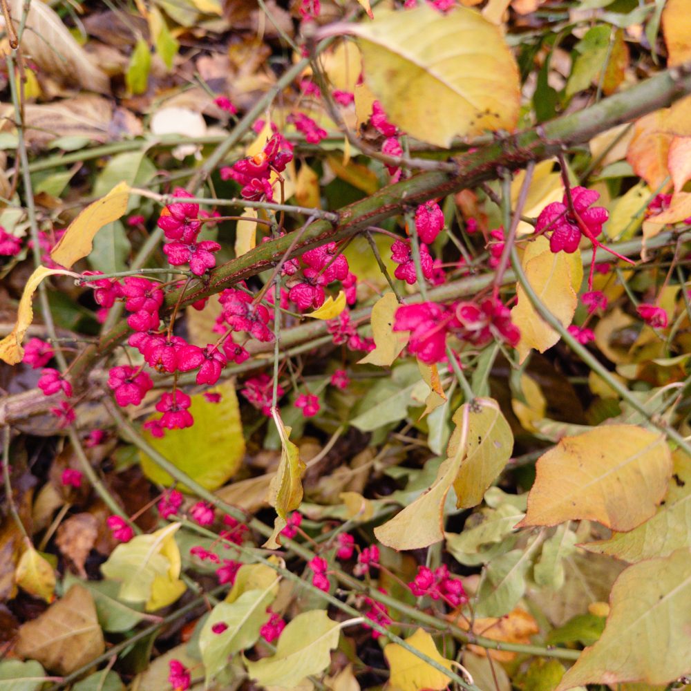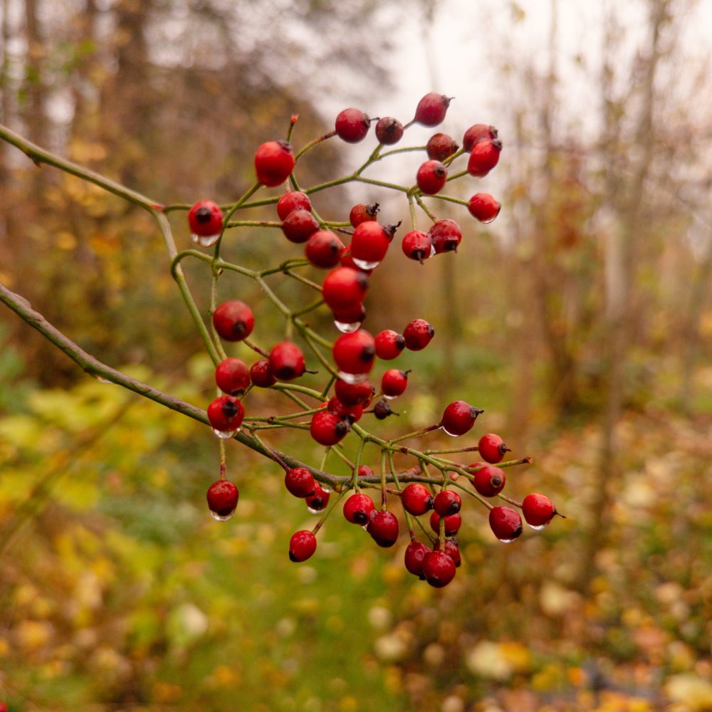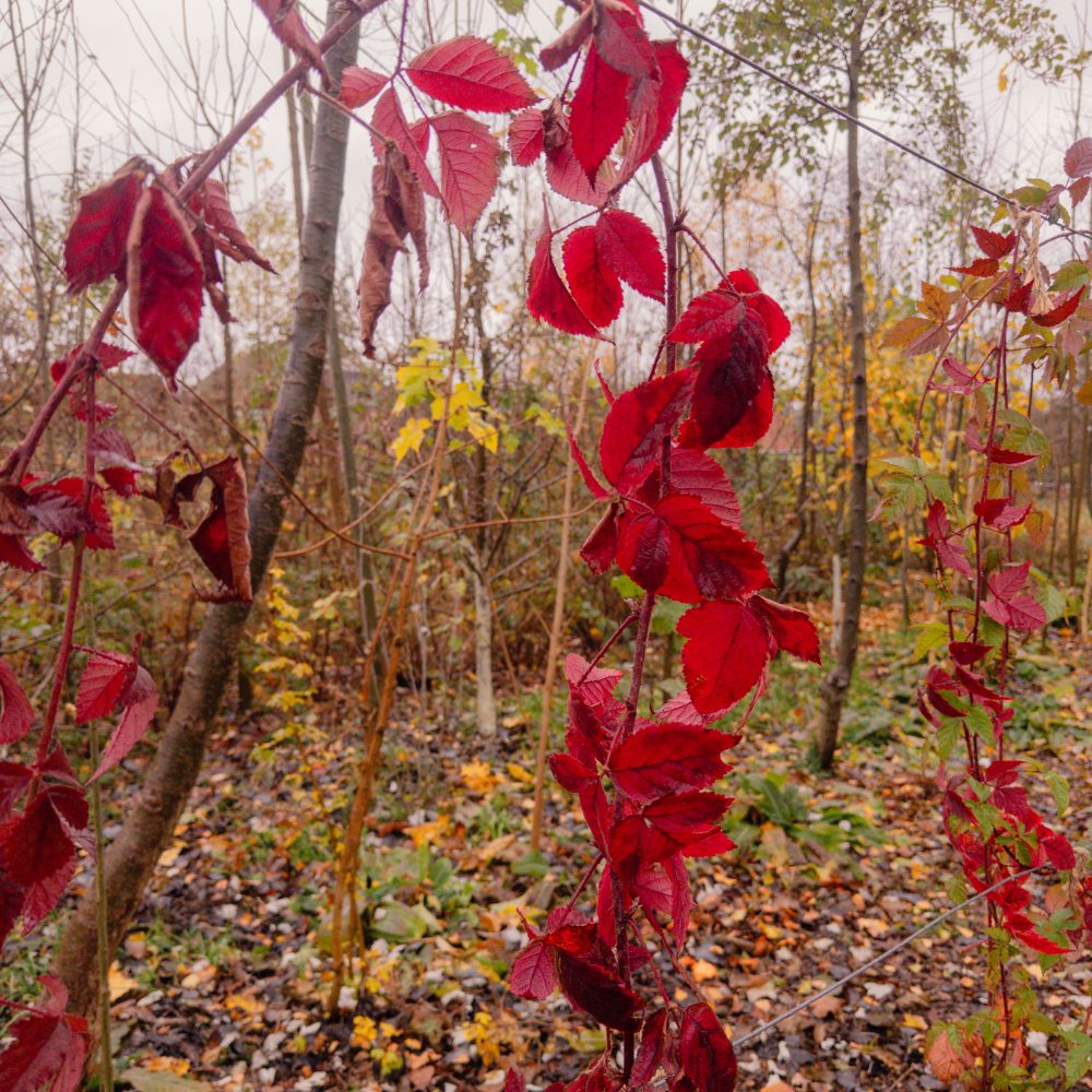 Die Pionierbäume werden aufgeastet und das Schnittgut und Laub bodendeckend verteilt, Nichts wird weggeräumt. Hier entsteht unser größter Schatz: Guter Boden. Pilze und Kleinstlebewesen leisten ihre wertvolle Arbeit im Verborgenen. Die Natur beschenkt uns noch mit ein paar Farben.